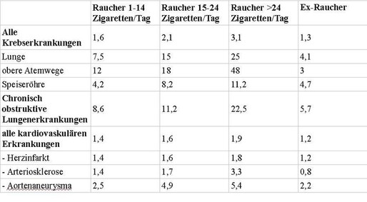 Erhöhtes Sterblichkeitsrisiko (relative Risikoerhöhung) von Rauchern gegenüber Nichtrauchern